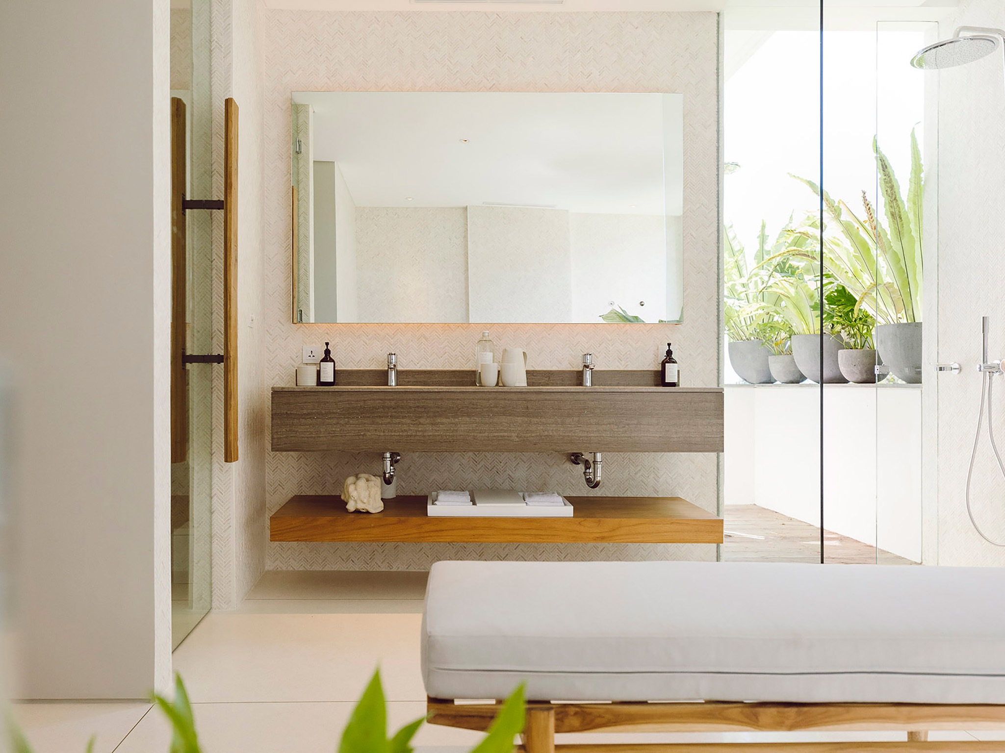 - Indoor-outdoor tropical style ensuite bathroom with twin vanity